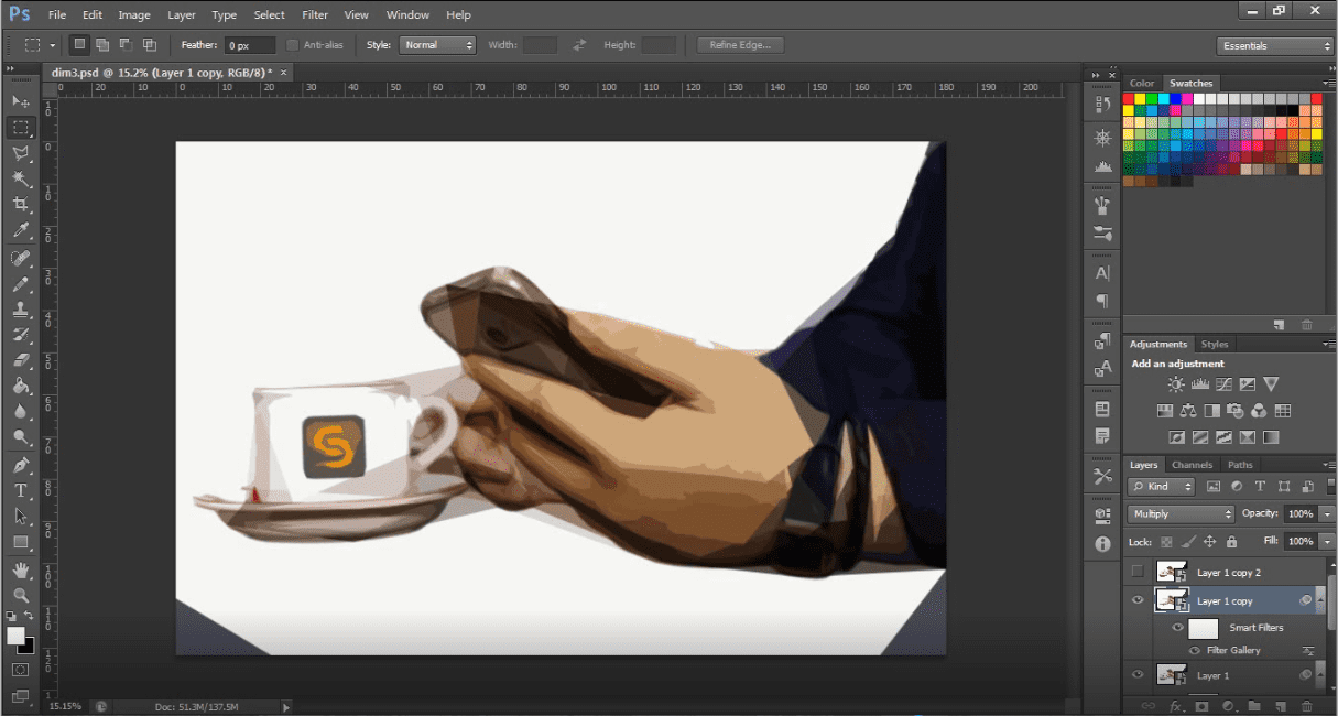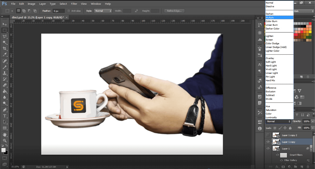 Sekarang kita berpindah ke layer cutout 2. un-hide layernya kemudian pilih blending modenya menjadi multiply (sebelah kiri opacity) seperti gambar dibawah ini,