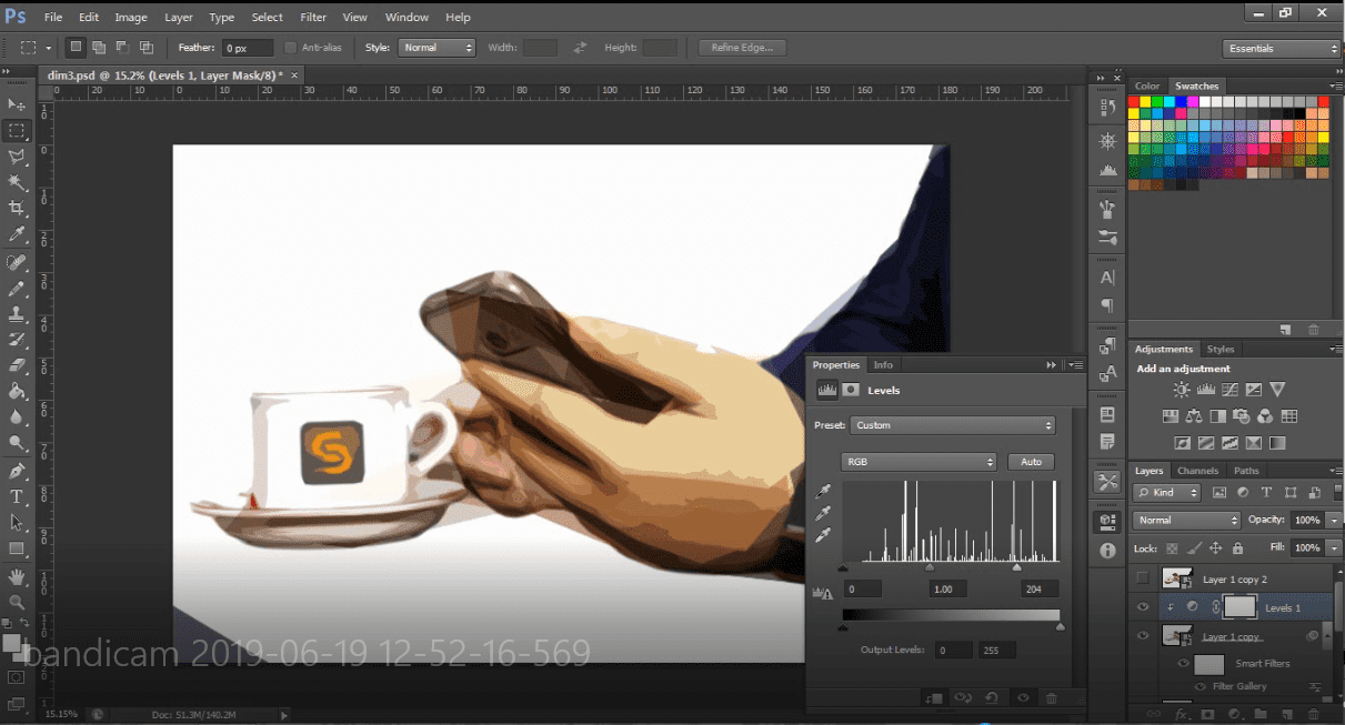 pada kolom levels agar efek dari level hanya untuk 1 layer dibawahnyaAtur levels agar gambar menjadi lebih cerah. Kamu bisa bereksperimen untuk menemukan settingan yang pas